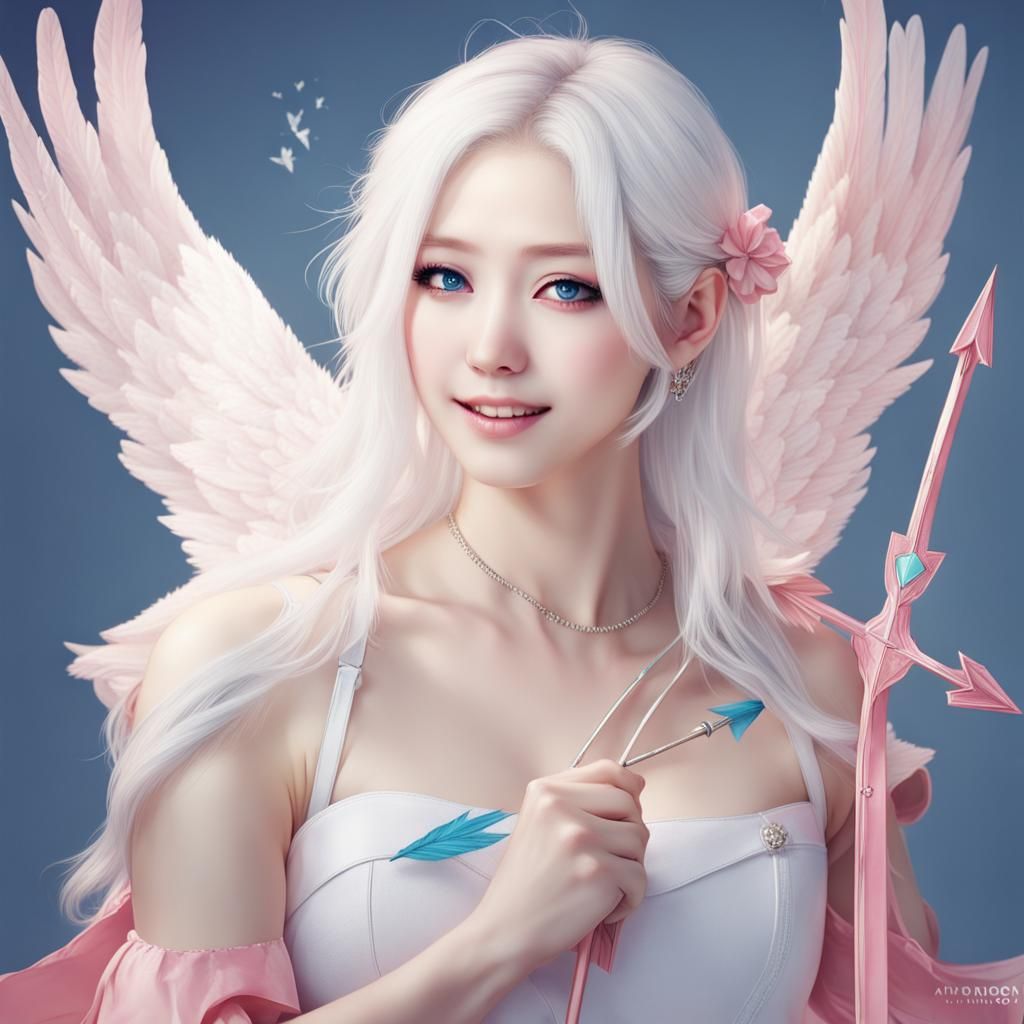 This image shows a K-pop style angel with white hair, blue eyes, and pink wings. The angel, reminiscent of Cupid, smiles while holding an arrow.