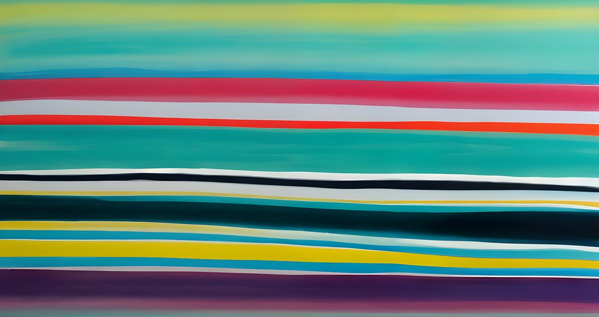 This image shows horizontal stripes in a vibrant colorfield painting style. The distinct layers feature colors ranging from cyan and light blue to cherry red and off-white, with wild brushstrokes.