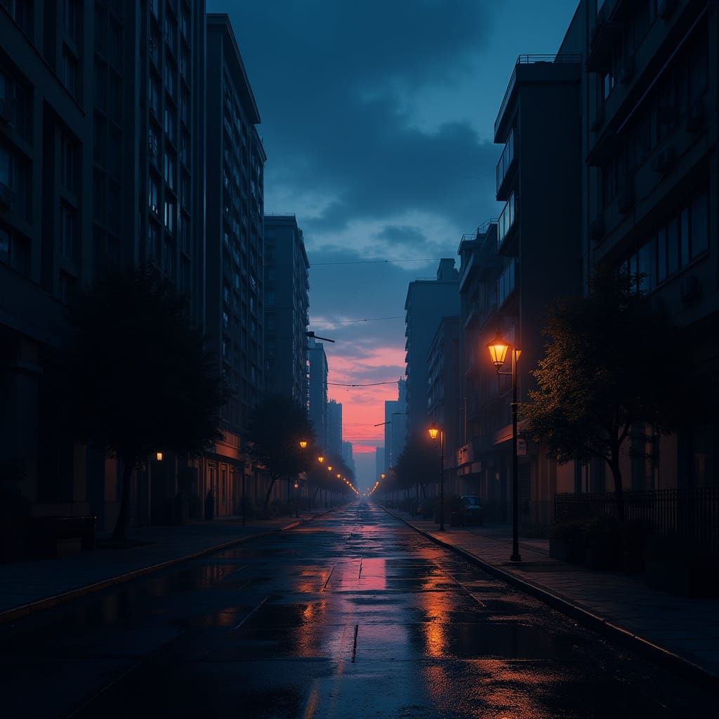 This hyper-realistic image captures a tranquil and melancolic cityscape at night, with a deep blue and purple sky and atmospheric lighting that creates a sense of depth and realism. The scene features detailed textures, surfaces, and architecture, with a subtle mist adding to the cinematic feel. The cont...