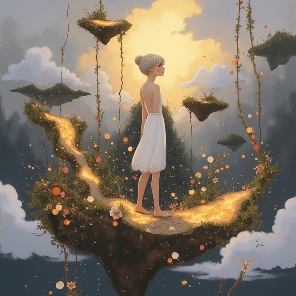 A digital matte painting showcasing a light-haired, green-eyed woman in a magical, twilight forest alive with bioluminescence, cash roses, and stars. Features floating islands and ethereal creatures in a fantasy landscape.