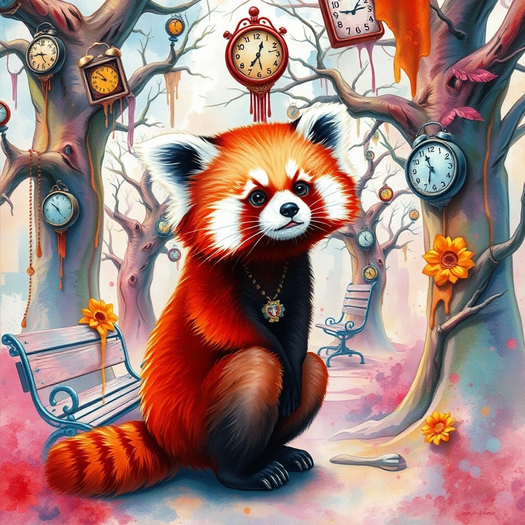 A red panda girl explores a surreal park with watchful trees and floating benches. Vibrant watercolor splashes create a whimsical yet eerie atmosphere.