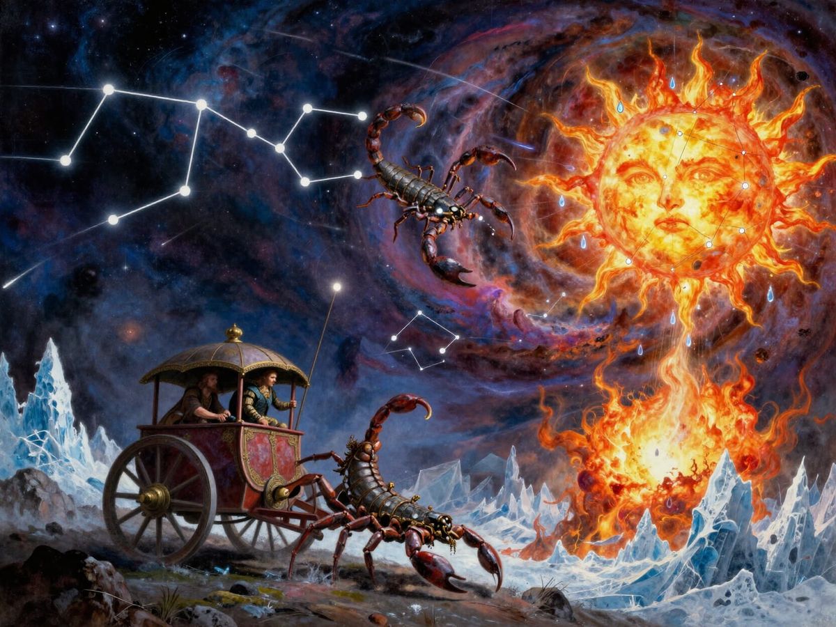 This image depicts a dramatic celestial war where constellations become chariots. A scorpion constellation battles the Sun amidst swirling nebulae and streaking comets, rendered in a vivid, epic art style.
