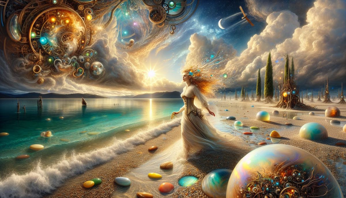An intriguing scene blends themes of steampunk and nouveau aesthetics into a space-fi opera setting. The scene radiates with transcendent beauty from the soft iridescence of a moonstone and the mechanical complexity of hyperfine circuitry creating an oddly enchanting charm. The focal point is a woman ...