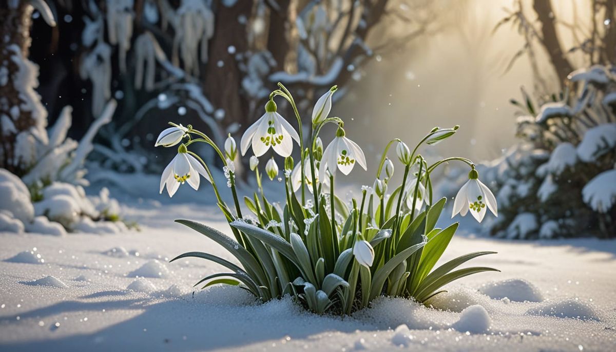 This image shows Galanthus flowers in early spring, gently swaying in the breeze. The scene, reminiscent of a surreal oil on canvas painting, features melting snow and a magical, ethereal light.