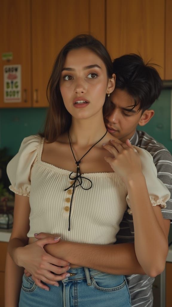 This image shows a young woman in a jungle setting surprised by a young man placing his hands on her shoulders. The scene is warmly lit, highlighting their intimate and playful interaction.
