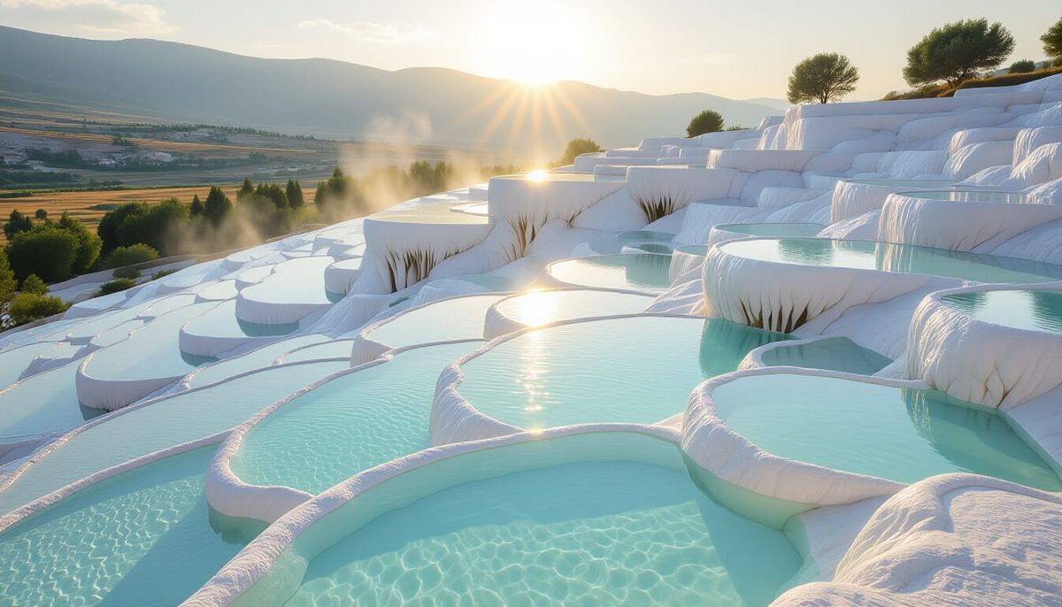 This image captures the Pamukkale terraces in Turkey, a 'cotton castle' of white travertine filled with turquoise thermal water under warm sunlight. Mist rises, creating a dreamy atmosphere.