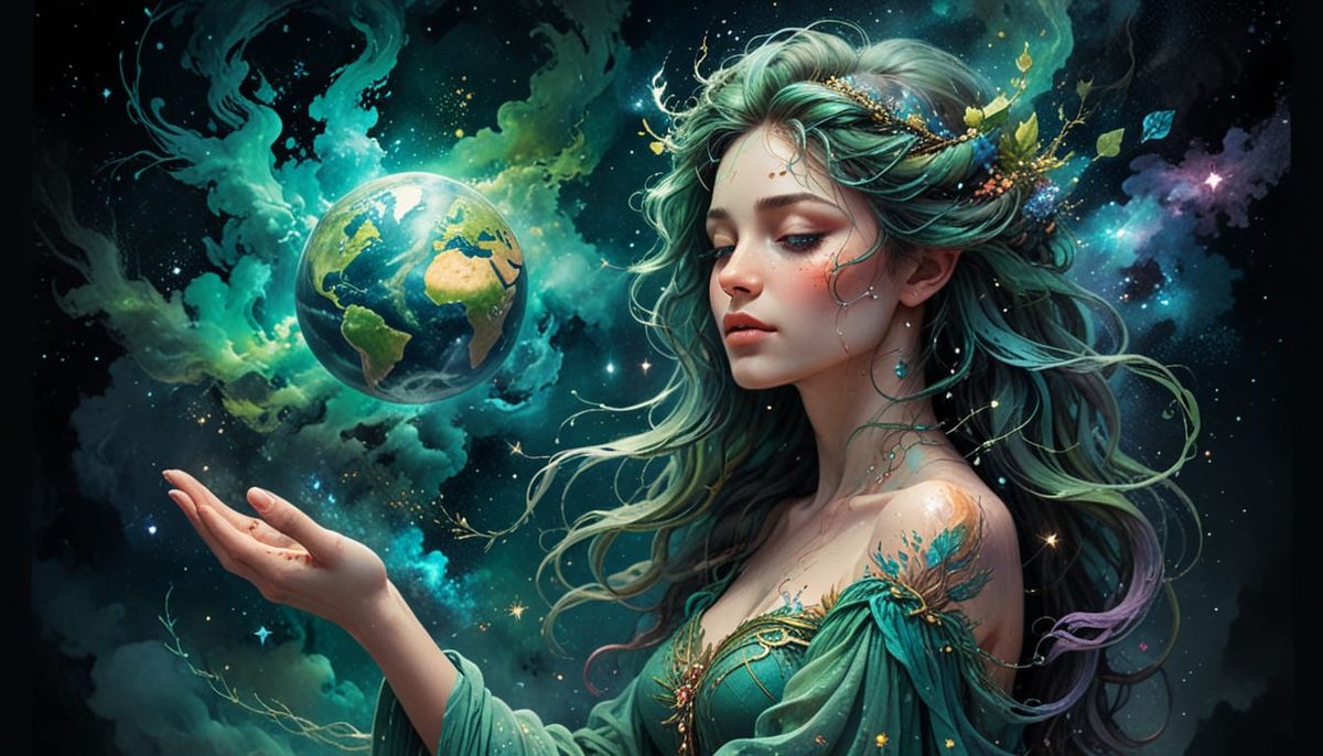 A mother goddess lovingly holds the earth, surrounded by swirling galaxies and nebulae, with lush forests, oceans, and mountains. Rendered in a soft pastel and jewel-toned watercolor style