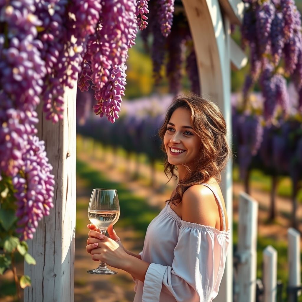 A serene woman gazes out at a picturesque grape vineyard, surrounded by full-blooming wisteria flowers and warm, golden light, in a photorealistic style with intricate details and textures.