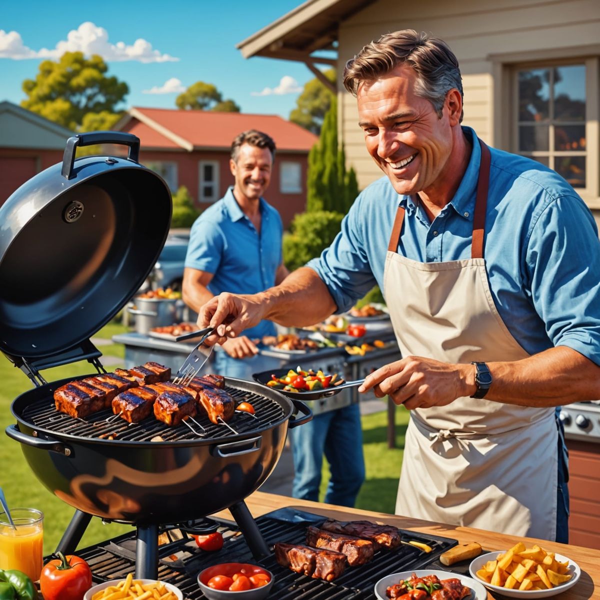 A hyperrealistic image of a happy father grilling at a barbecue in Australia. The mid-shot features intricate details, dramatic lighting, and a colorful background in a splash art style.