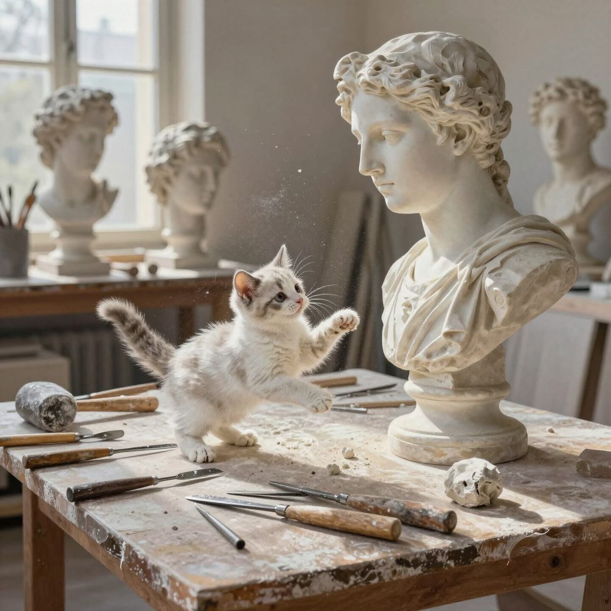 This image shows a sculptor's studio with marble busts and tools. A magical kitten plays with a tool, illuminated by natural light in an impressionistic style.