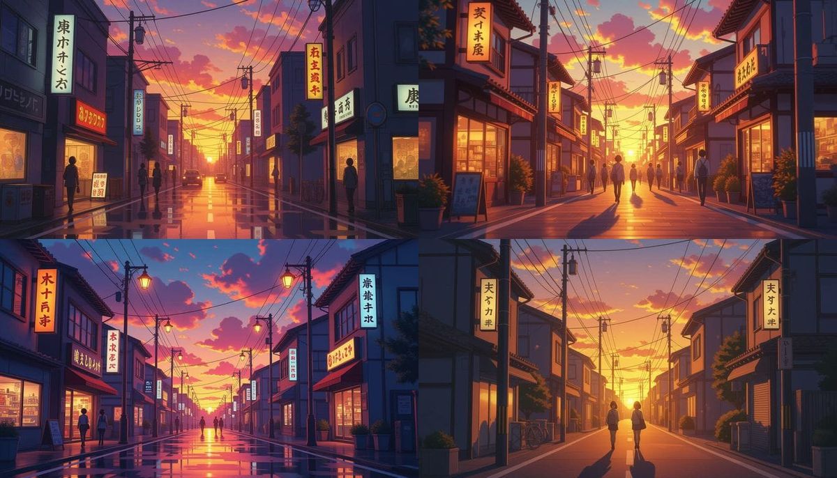 anime street at sunset, ultra realistic lighting, warm tones, cinematic atmosphere
