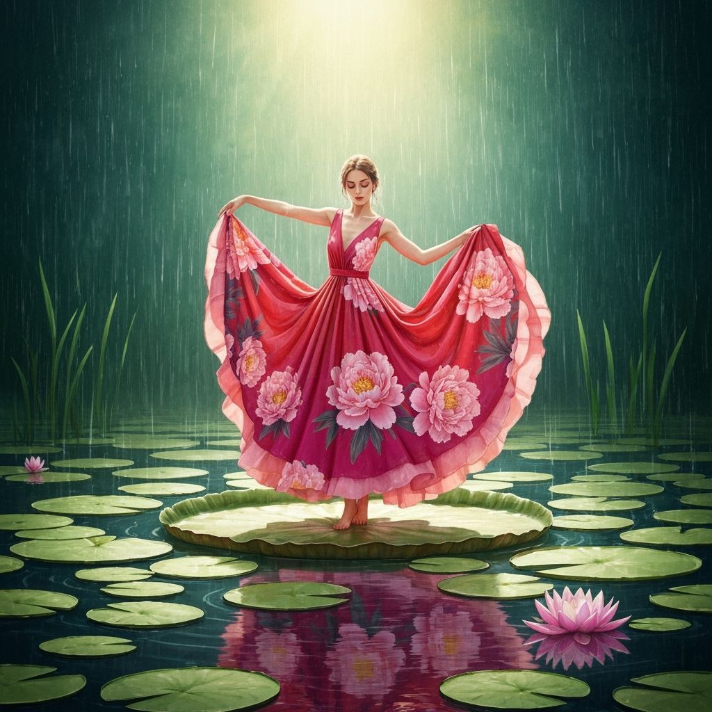 This image shows a woman in a red and pink peony dress dancing on a lilypad in the rain. The artwork is rendered with thick brush strokes and textured layers in an impressionist style.