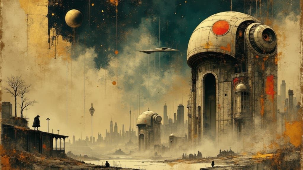 A gritty noir scene of two massive, rustic mecha-robots demolishing an alien city with muted colors. Two moons and a starfield are visible in the background.