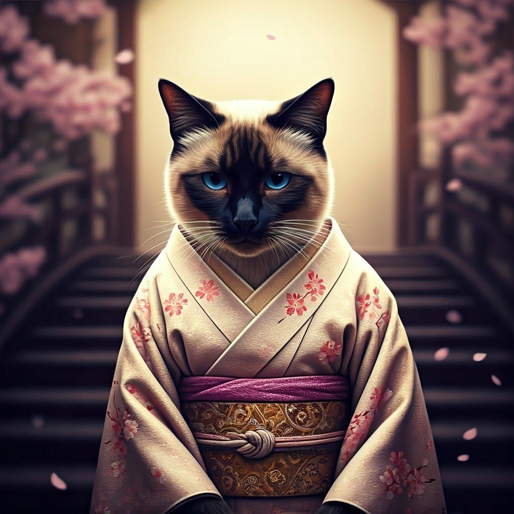 A close-up of a Siamese cat in a kimono, portraying Cio-Cio San on stage. The feline's sorrowful expression and the falling cherry blossoms evoke the drama of an opera in a Hokusai-inspired style.