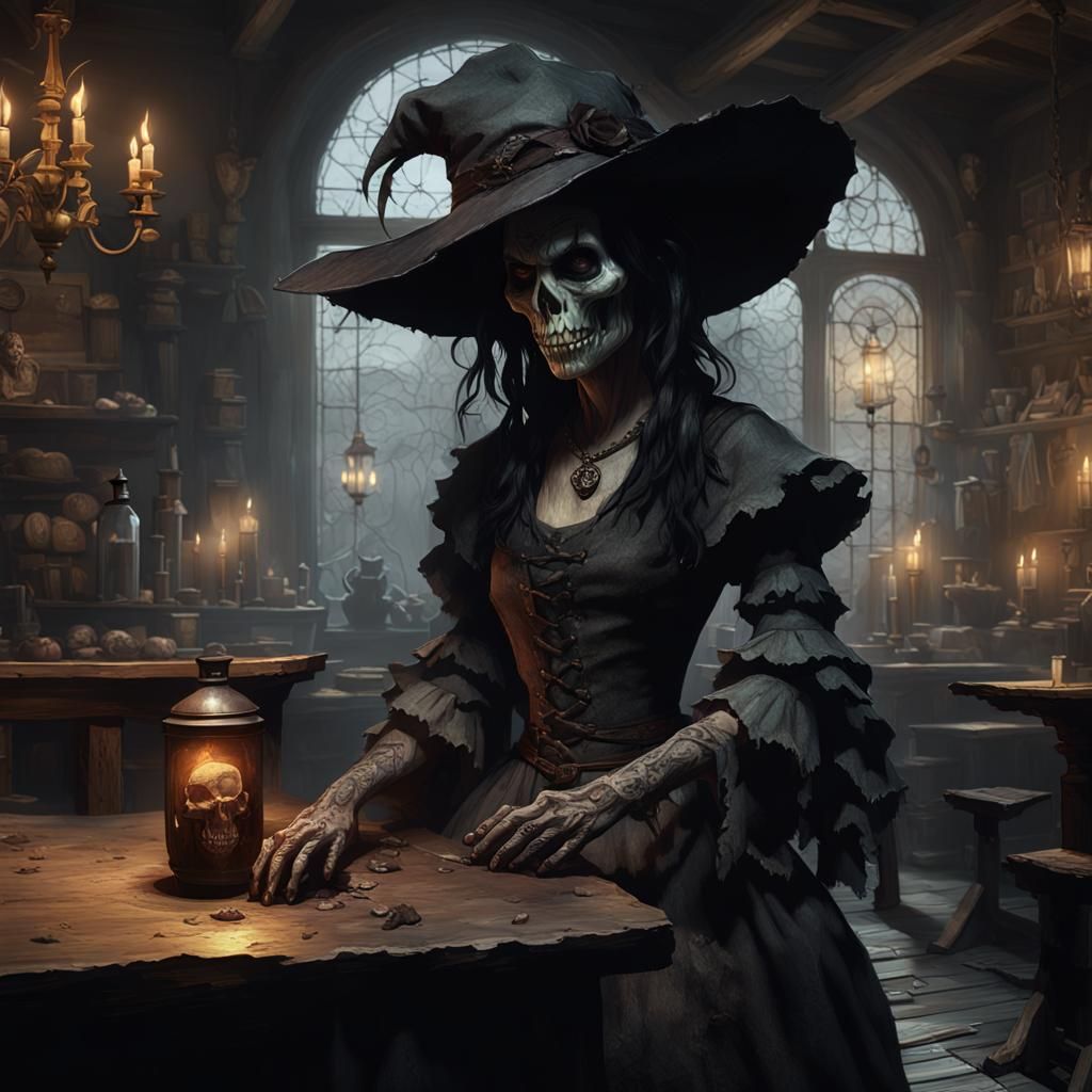 A dark fantasy image shows a creepy old changeling with long black hair. She wears a tattered dress and a deer skull hat, rendered with dynamic lighting and deep colors.