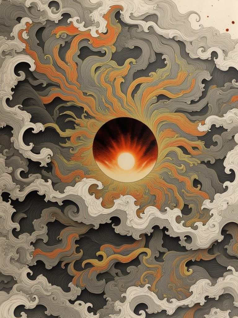 <lora:Japanese landscape:1.0>living molten polychromatic sun, deep meticulous Japanese style Edo ink wash, make it more novel, golden mean composition