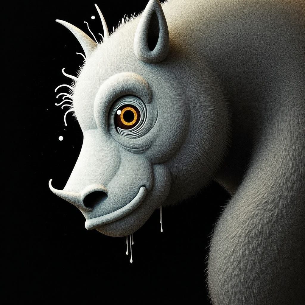 This image shows a close-up portrait of a beast-man with contrasting eyes, one intelligent and the other wild. Sweat glistens on the character's fur-covered face.