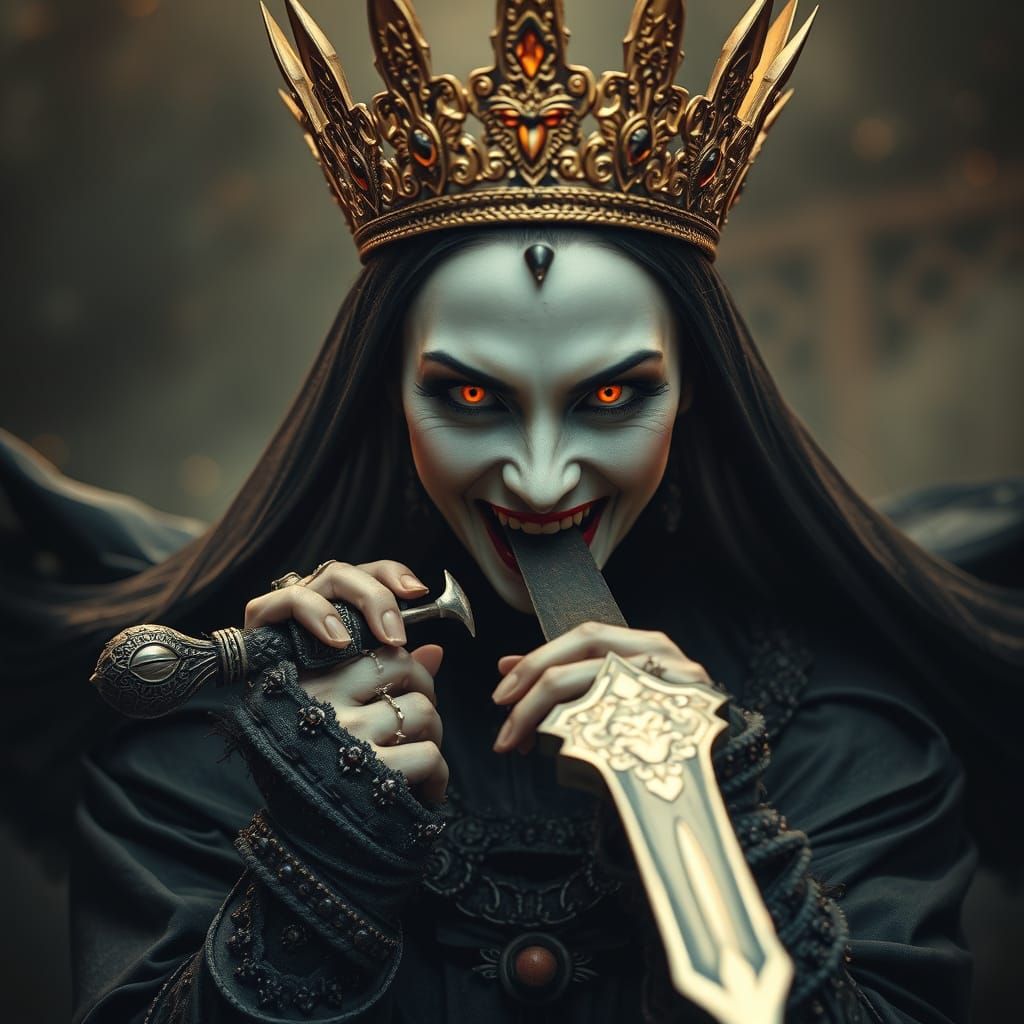 A photorealistic portrait of a vampire queen with piercing orange eyes. She wears a crown and dark attire, and is surrounded by a sinister, eerie atmosphere in a dark, gothic style.
