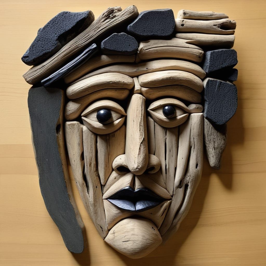 Unleash your creativity with our free AI image generator. Easily create abstract, artsy faces using driftwood and stones.