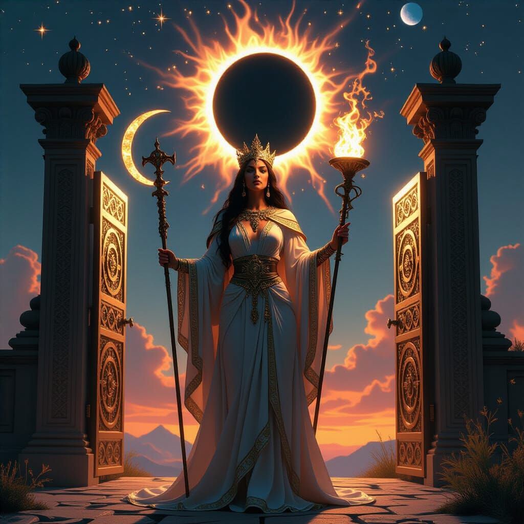 A fierce, regal High Priestess guards a cosmic gate during a solar eclipse. Her robes feature fractal patterns, holding symbols of harvest and alchemy. Mystical, visionary art style.