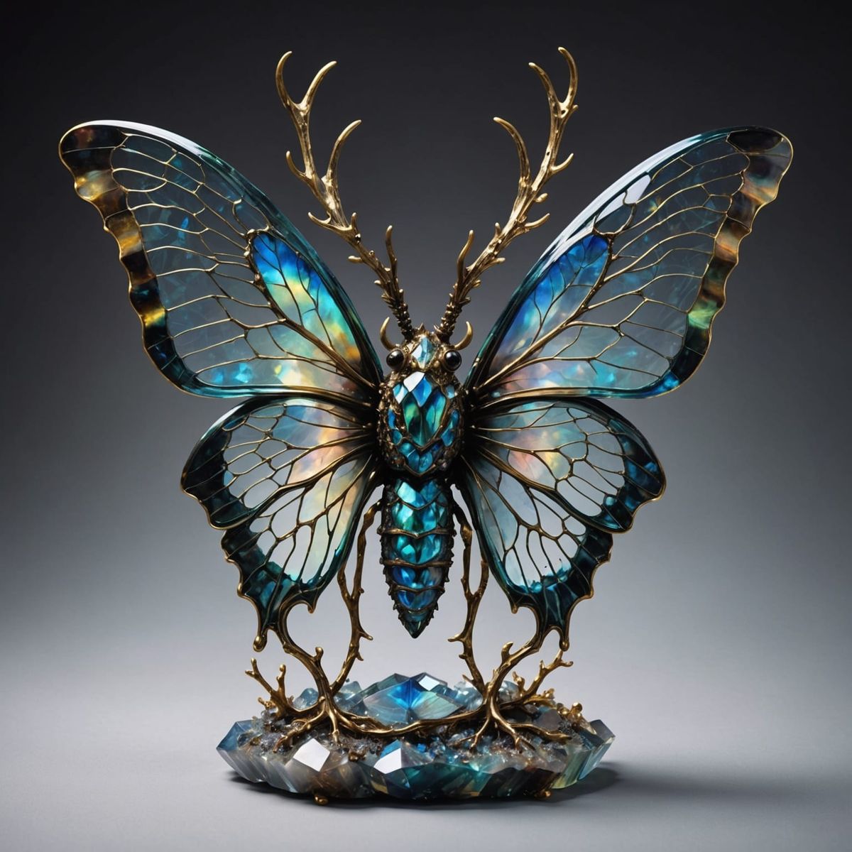 A mesmerizing sculpture of a Chimera Moth-Stag with delicate wings and bioluminescent antlers. This highly detailed artwork evokes organic surrealism and the elegance of Art Nouveau.