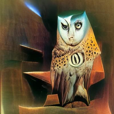 This image shows an owl with human eyes in a cubist style. The artwork evokes early 20th-century abstract art through fragmented forms and multiple perspectives.