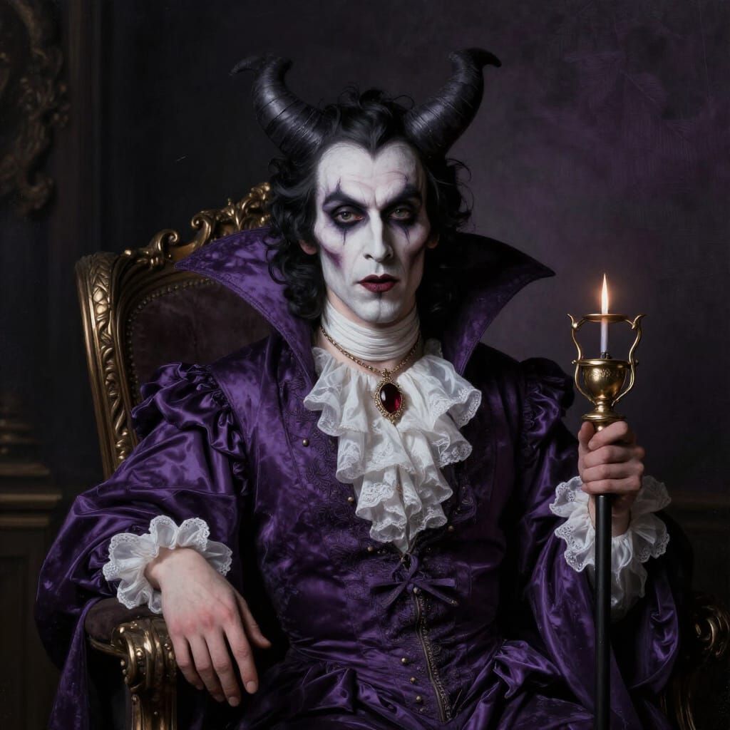 This image depicts a Baroque interpretation of Mephistopheles, rendered in deep purples, evoking the dramatic and opulent style of Franz von Stuck.