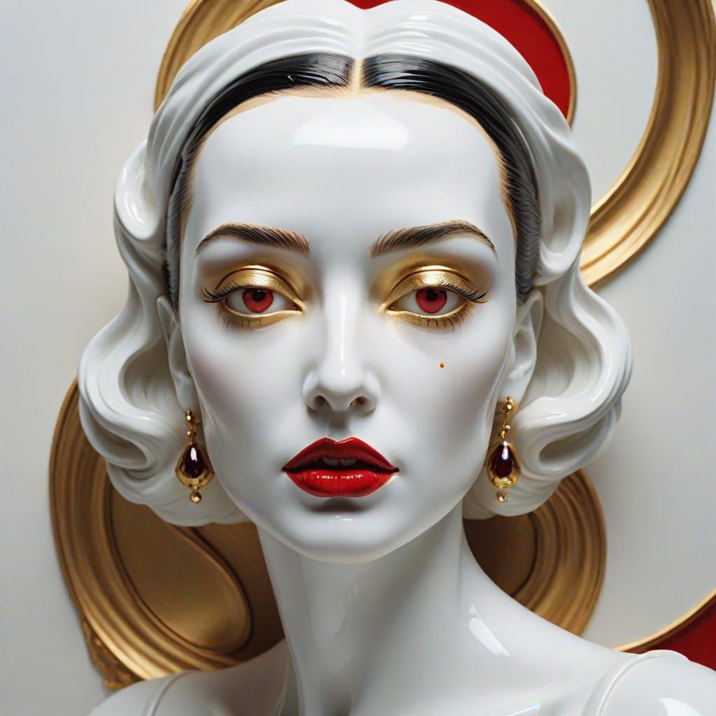 Young woman made of white porcelain. Her ruby red lips contrast...