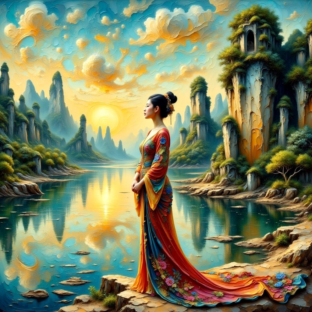 A breathtaking view of the Li River winding through Guilin, China. The image captures the river's beauty amidst karst mountains and verdant hills, rendered as impasto oil painting.