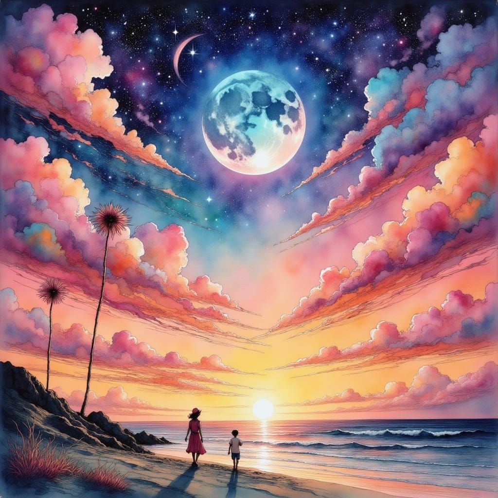 This image shows a serene scene of a woman and child amidst towering desert sand dunes, with a distant ocean horizon, in a dreamlike, impressionist-inspired aesthetic.