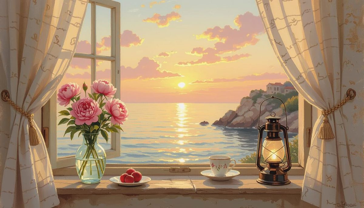 A shabby chic style image of an open window overlooking the sea at sunset. Gentle pastel colors and light curtains create a breezy, impressionistic feel, enhanced by peonies and an antique lantern.