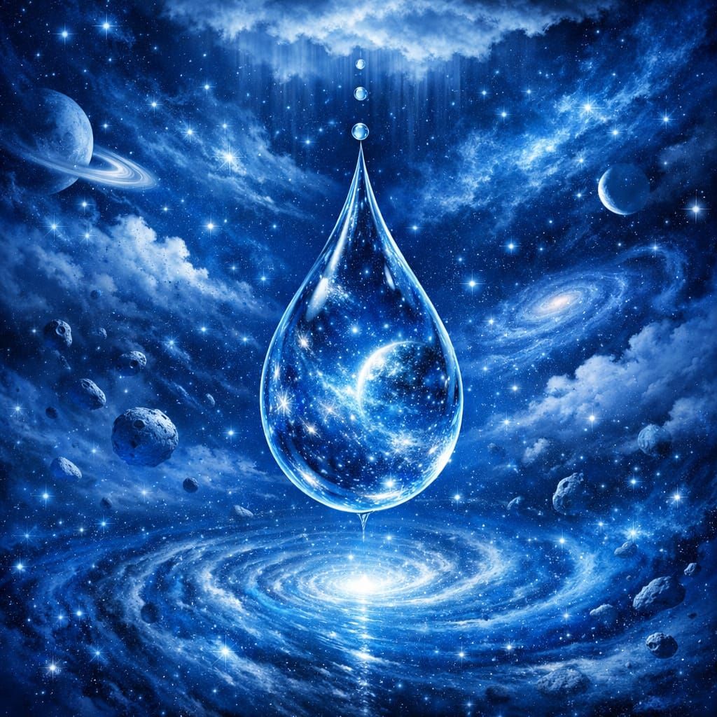 This image depicts a single raindrop suspended in the vast expanse of the universe, rendered in a dominant blue color palette with a surrealist aesthetic.