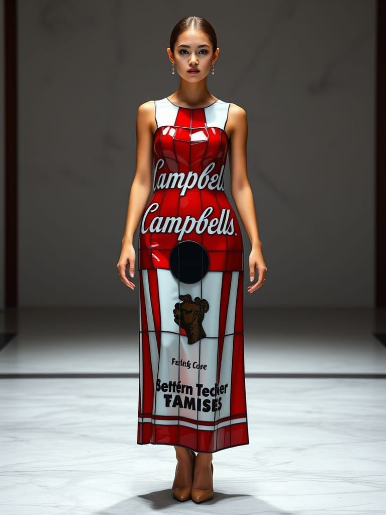 A photorealistic image of a woman in a striking dress crafted from polished stained glass, mimicking a Campbell's soup can design. Cinematic lighting enhances the glossy, reflective surface.