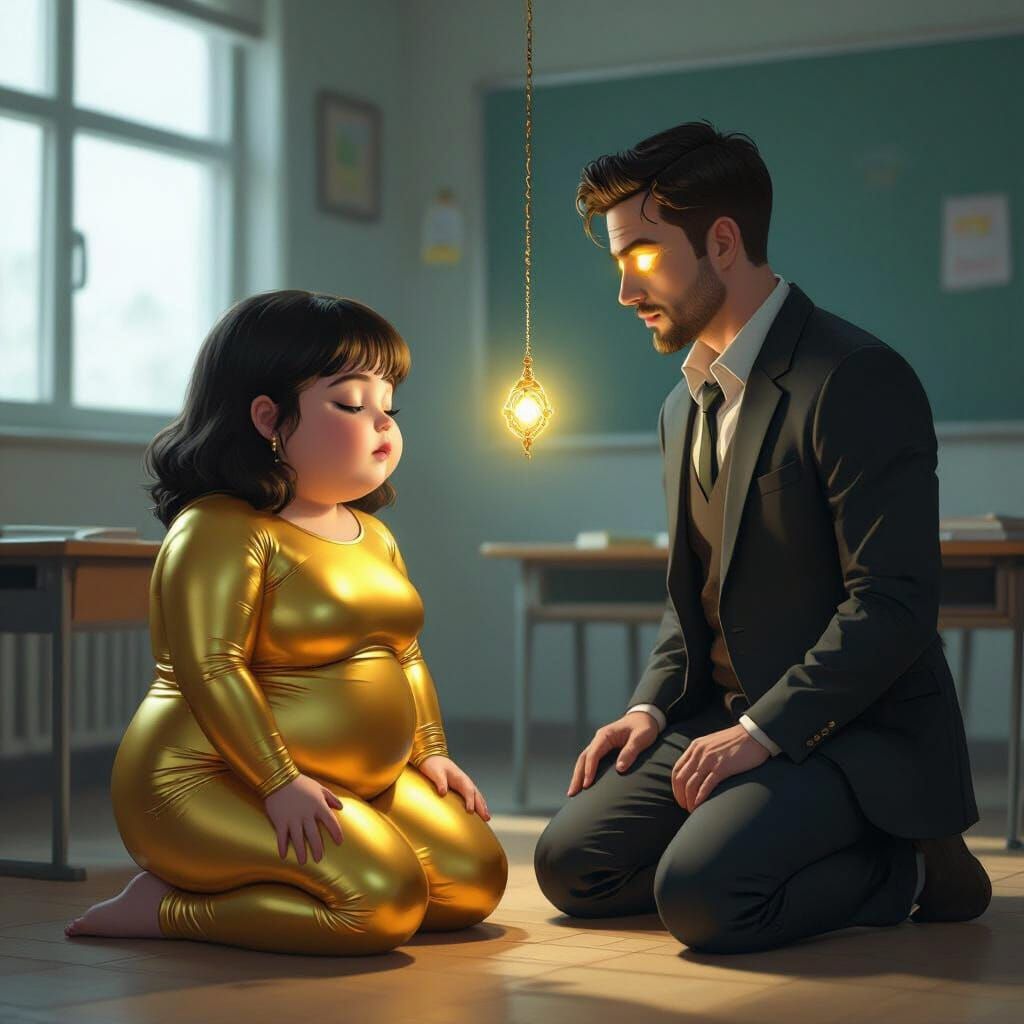 This image shows a girl in gold spandex kneeling, seemingly hypnotized by a man in a classroom. The scene blends mystical and psychological elements in a digital art style.