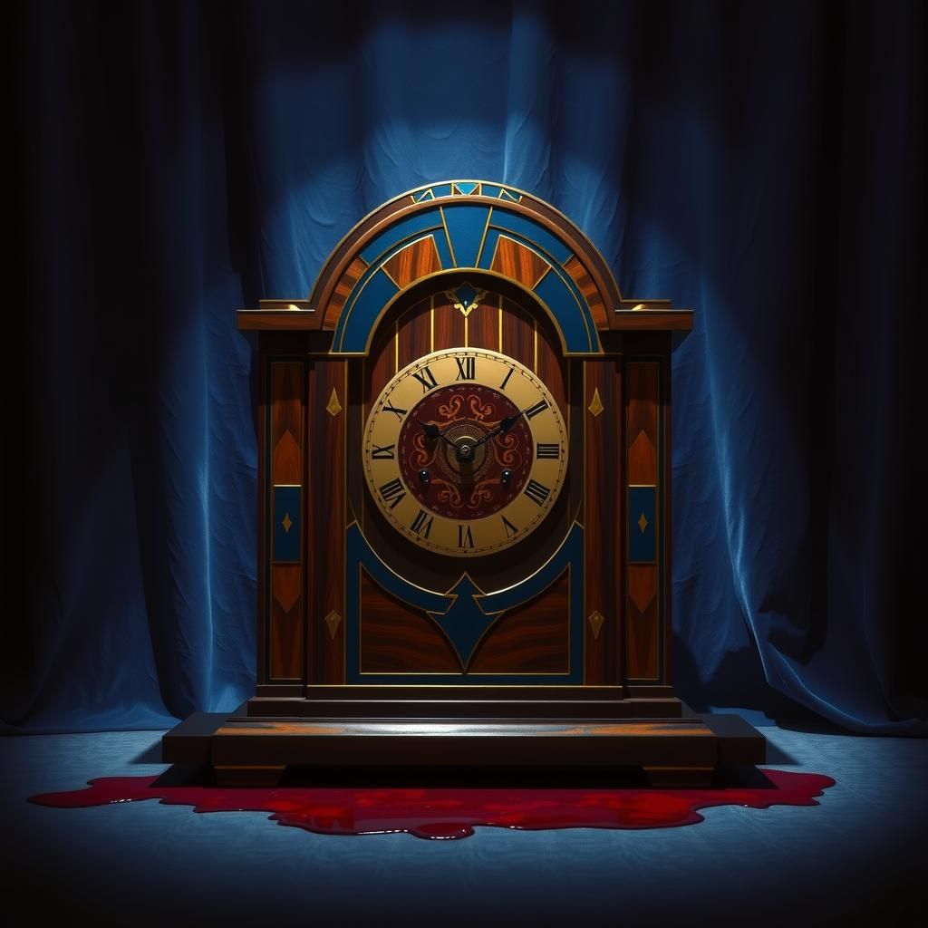 A striking picture of an ornate vintage Art Deco clock. The clock features intricate wood inlays, luxurious blue and gold accents, and a splash of crimson blood against a velvety blue backdrop.