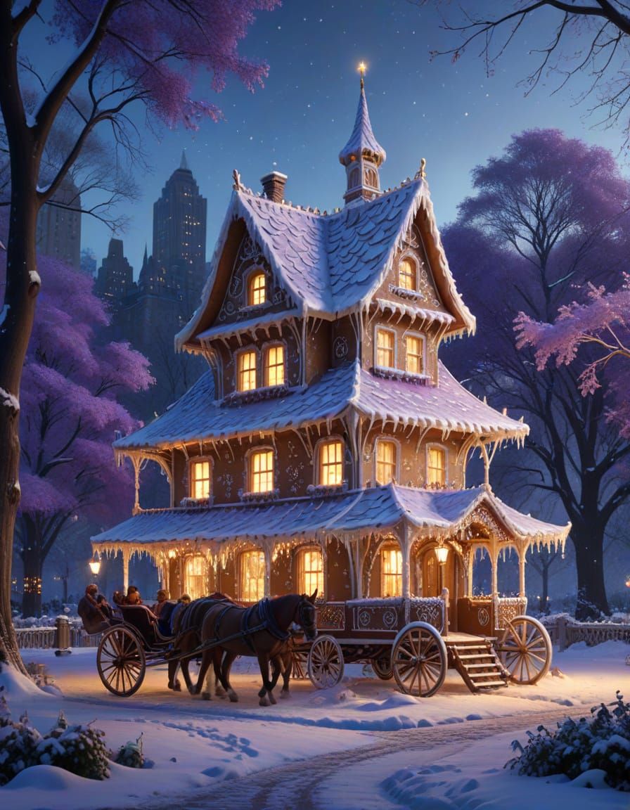 This image shows a detailed gingerbread house in Central Park on a snowy winter day. Horse-drawn carriages pass by in the warm golden light, in a fantasy concept art style.