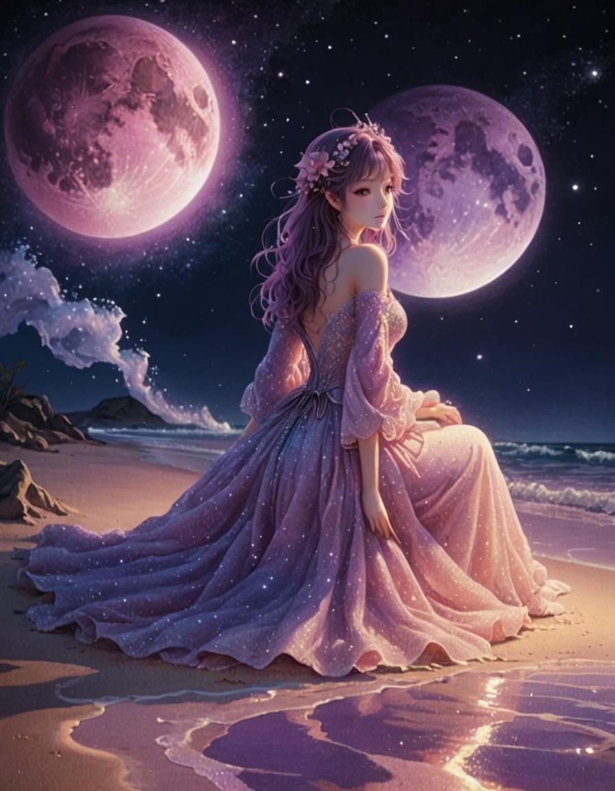 A close-up image of a pink sand woman on a moonlit beach. The image evokes a dreamy 80s anime style with pointillism, combining vibrant pink and purple hues with soft ethereal light.