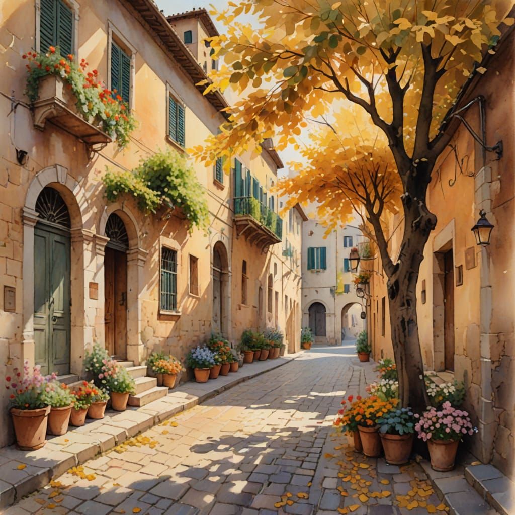 A watercolor painting of an old Italian street in autumn. The artwork captures a serene scene with flowers, a tree, and soft, warm lighting, reminiscent of impressionist paintings.