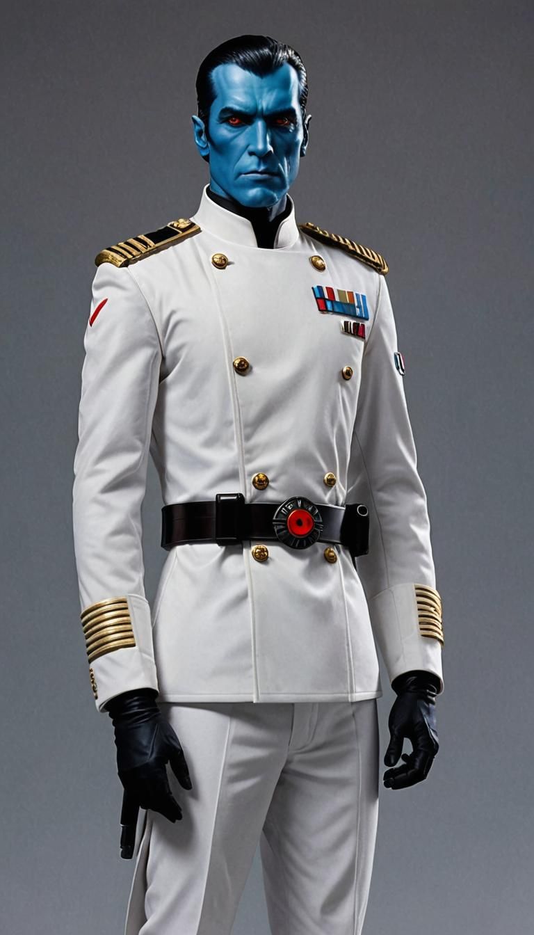 This image shows the iconic Star Wars villain Admiral Thrawn, with his distinctive blue skin, piercing red eyes, and immaculate white Imperial uniform.