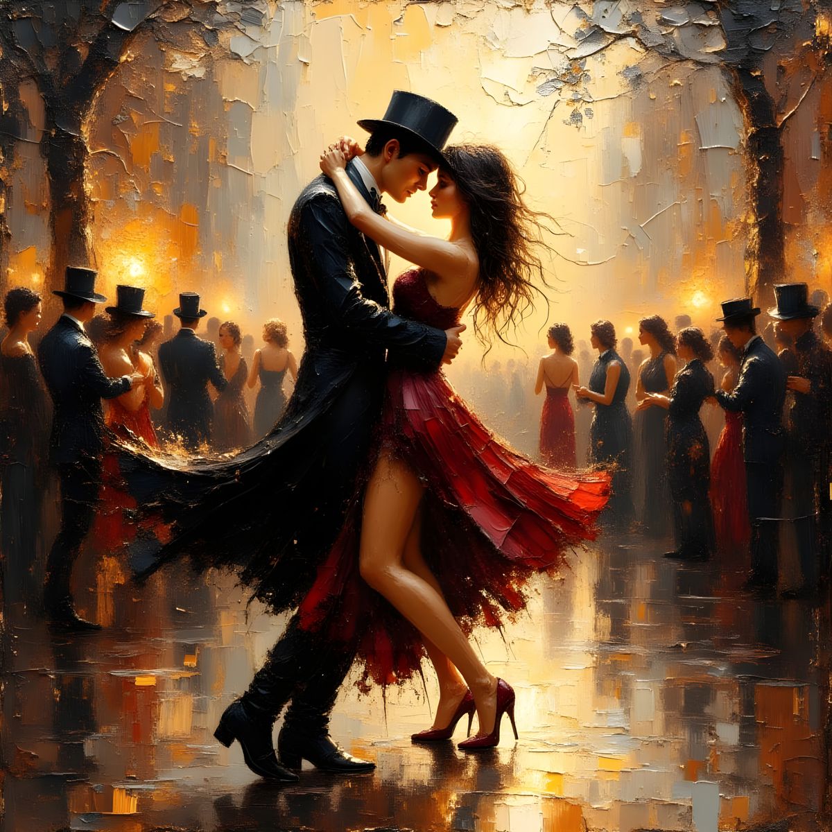 This image captures a dynamic Argentine tango performance with thick, textured brushstrokes and magical lighting. A couple in striking attire captivates onlookers in a vibrant, fine art masterpiece.