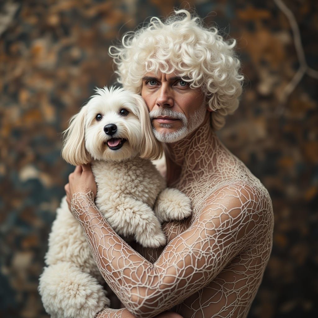 This image is a beautiful depiction of a handsome man surrounded by flowers, holding a delicate female dog with long hair, set against a background of intricate patterns and textures.