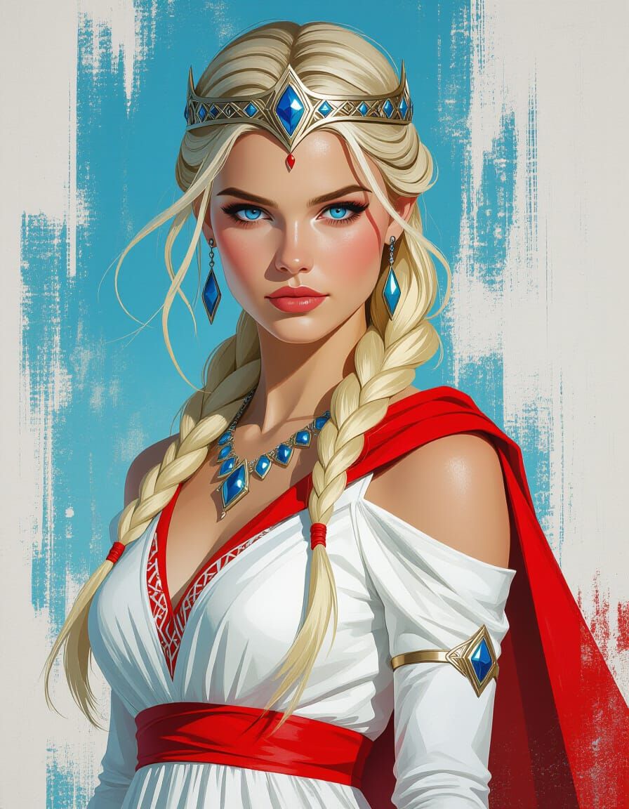This image shows a stunning Norse goddess with flowing blonde hair, wearing a white dress and sapphire diadem. The artwork blends airbrush realism with graffiti art elements in a colorful polychromatic style.