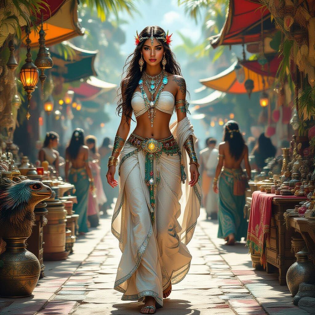 A striking picture of a bird-human hybrid walking through an alien marketplace. The figure is adorned with glowing tattoos and jewelry, rendered with ornate Art Nouveau-style details and vibrant colors.