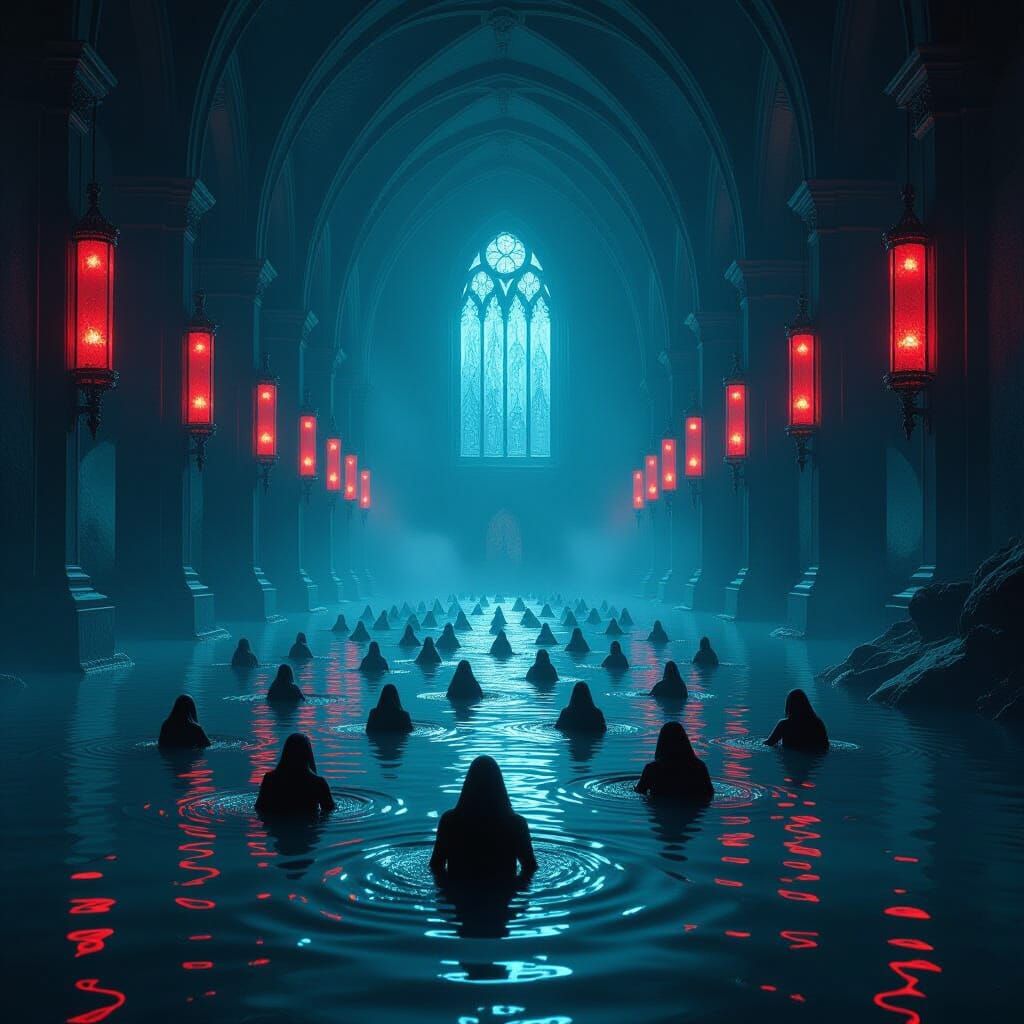 This dark fantasy concept art depicts a gothic cathedral dungeon leading to a lake where demons carry dead bodies. Features eerie glow and dramatic lighting.