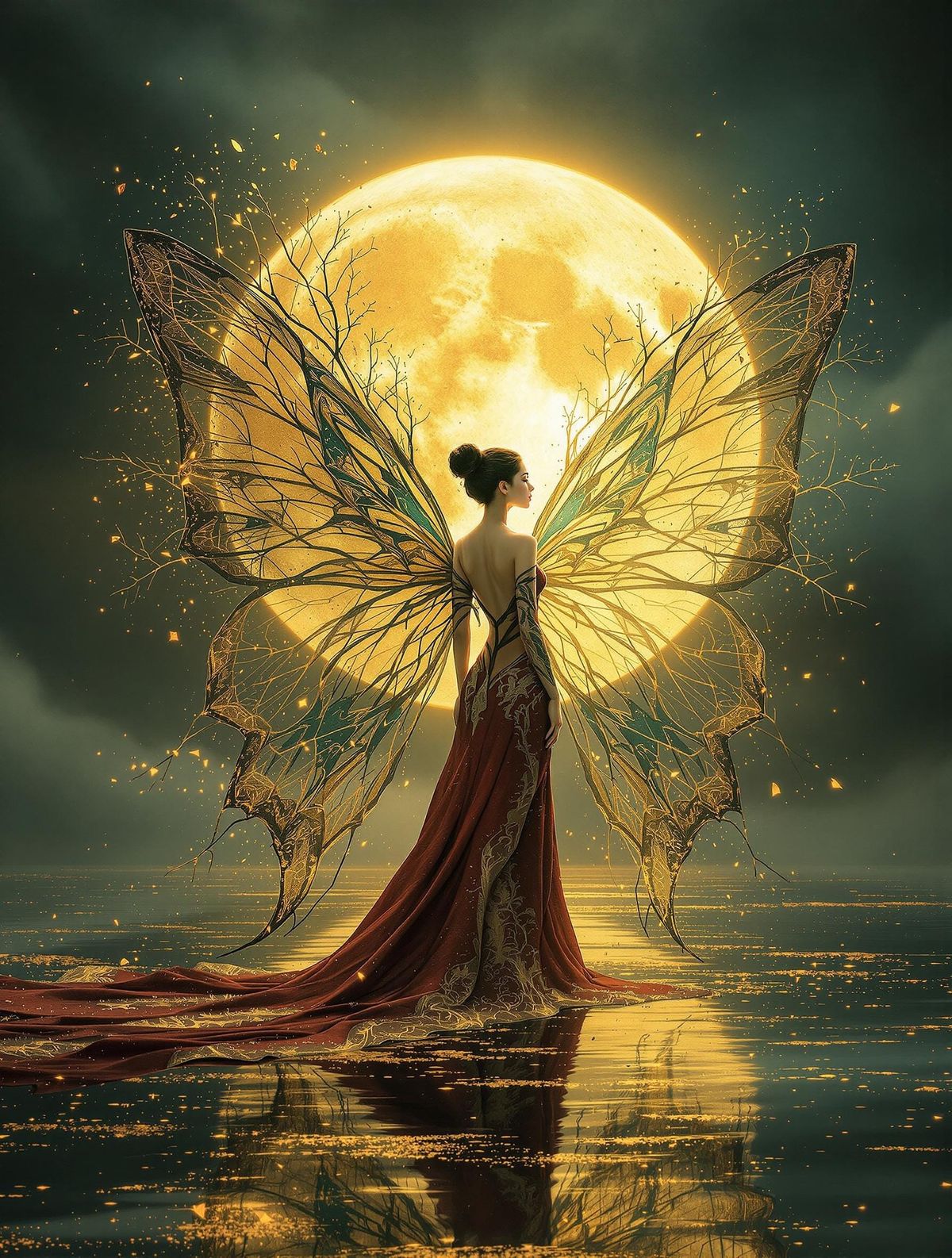 This digital art depicts a woman with a high bun, wearing a crimson gown with gold filigree. She has large, teal butterfly wings, with one wing disintegrating into golden fragments.