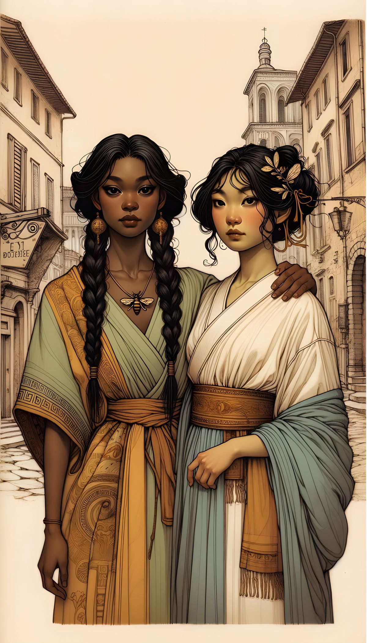 This image shows two women in classical Greek attire standing arm in arm in a 19th-century Florentine street, gazing at the viewer. The artwork features intricate detailing and a whimsical fantasy style.