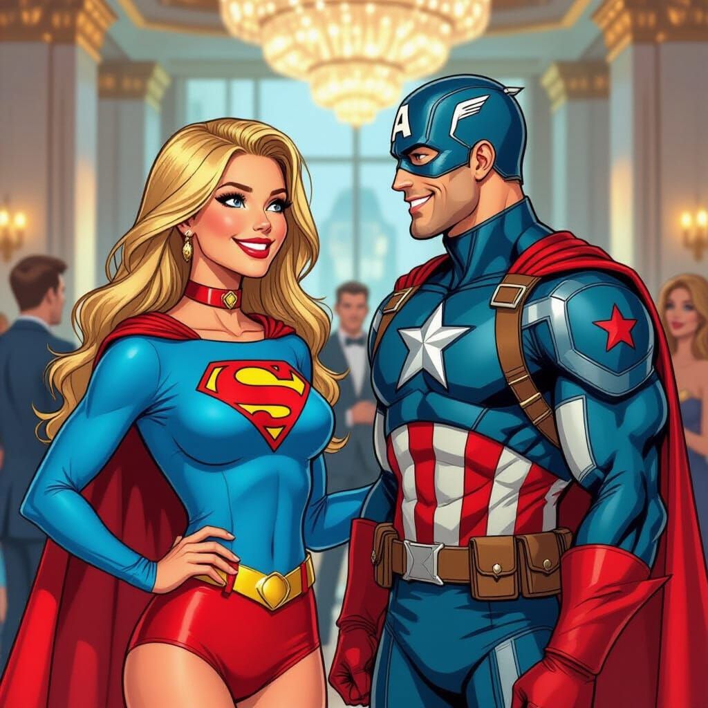 This image shows Supergirl flirting with Captain America at a party. The artwork is reminiscent of hand-drawn color comic art from the Bronze Age, with a smooth finish.