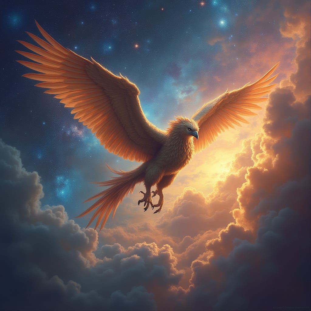 This image shows a majestic griffin flying through a vibrant nebula. Rendered in a classic fantasy illustration style with rich colors and dramatic lighting, evoking digital painting techniques.