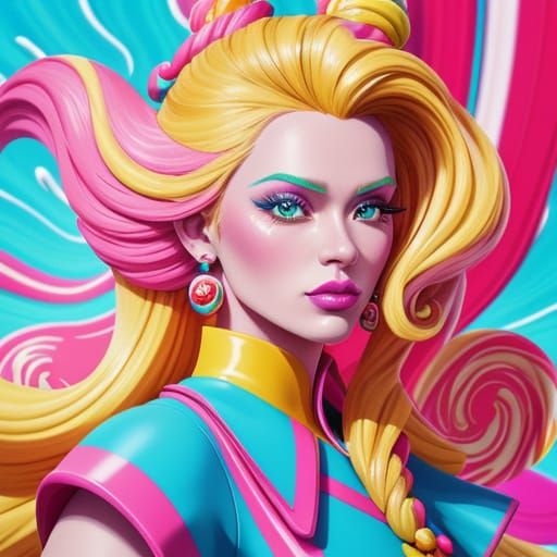 This digital illustration features a hyperdetailed, close-up portrait of a blonde character in a whimsical Candyland art style. Features vibrant colors, sugary textures, and dynamic lighting.