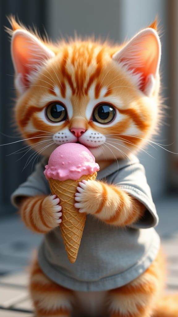 A hyperrealistic portrait of a fluffy orange tabby kitten. The kitten is wearing an oversized t-shirt and delicately licking a pink ice cream cone, with a blurred urban background, rendered with soft studio lighting.